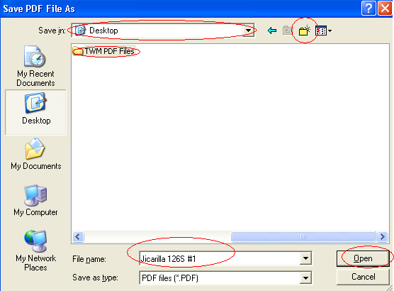 7. Save the file to a location. In this example, the file is saved to the desktop under a TWM PDF folder. Type the name of the well as the file name then click open. This saves the file to the desktop.