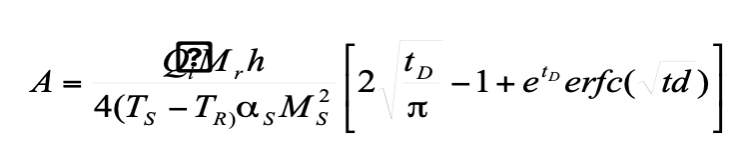 Marx-Langenheim solution involves the complementary error function (erfc) evaluated at dimensionless time (tD) which depends on reservoir thickness, the thermal rock properties of the reservoir (Mr) and under and overburden (Ms, αs).